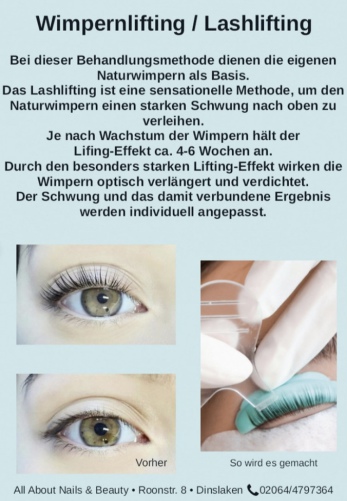 Je nach Wachstum der Wimpern hält der Lifting-Effekt 4-6 Wochen, und wenn Sie unser LongLashes Wimpernserum verwenden, hält der Effekt bis zu 10 Wochen (die Wimpern fallen nicht so schnell aus). Incl. Färben 59,-€